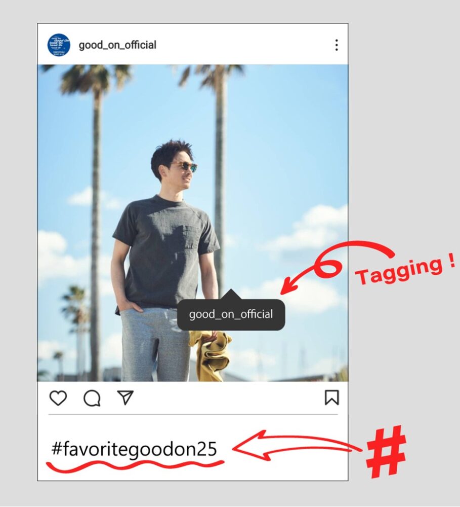 グッドオンの製品をお持ちのあなた!お気に入りのアイテムをインスタグラムにアップして自慢してみませんか?シャツでもスウェットでも、経年していてもしていなくても大歓迎。やり方は指定のタグを付けて投稿するだけ。見事グランプリに選ばれた方には、25周年記念Tシャツを進呈。また、期間中に恵比寿の「グッドオン フラッグシップショップ」で投稿画面を提示すると、スペシャルなノベルティバッグが先着でもらえるんだとか(なくなり次第終了)。これは投稿するしかない!