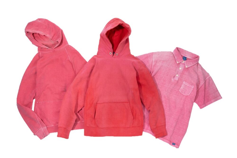 見かけることの少ないレッドカラーの経年変化。色落ちすることによって柔らかなピンクカラーへと変貌。特に中央のスウェットパーカは、美しいコンディンションに反してなんと着用年数25年を誇る。