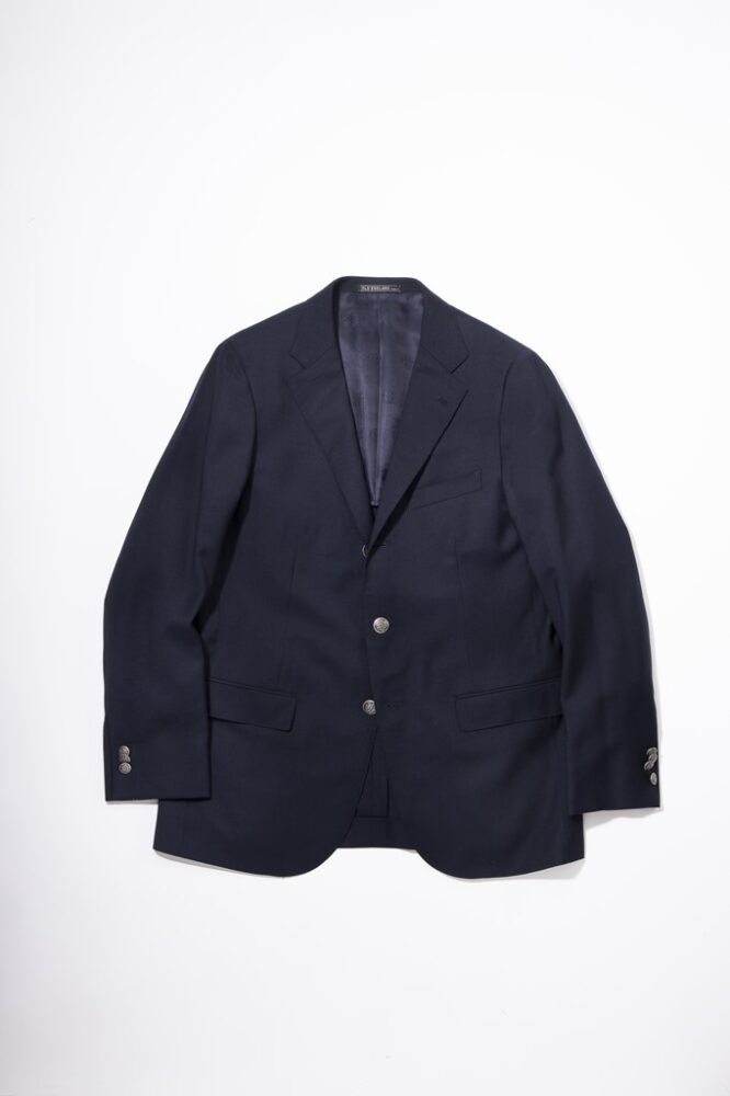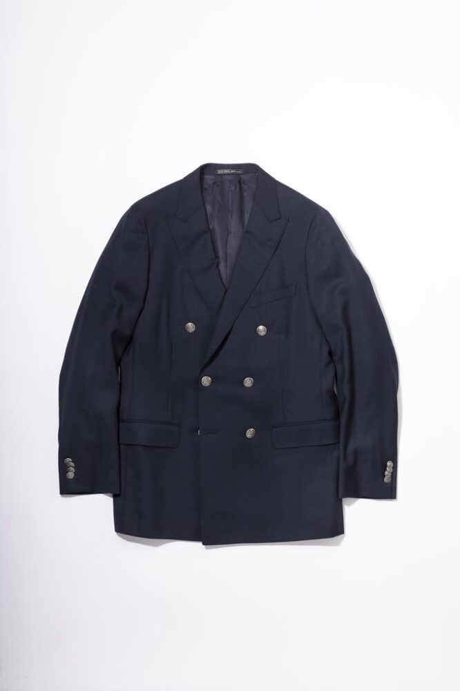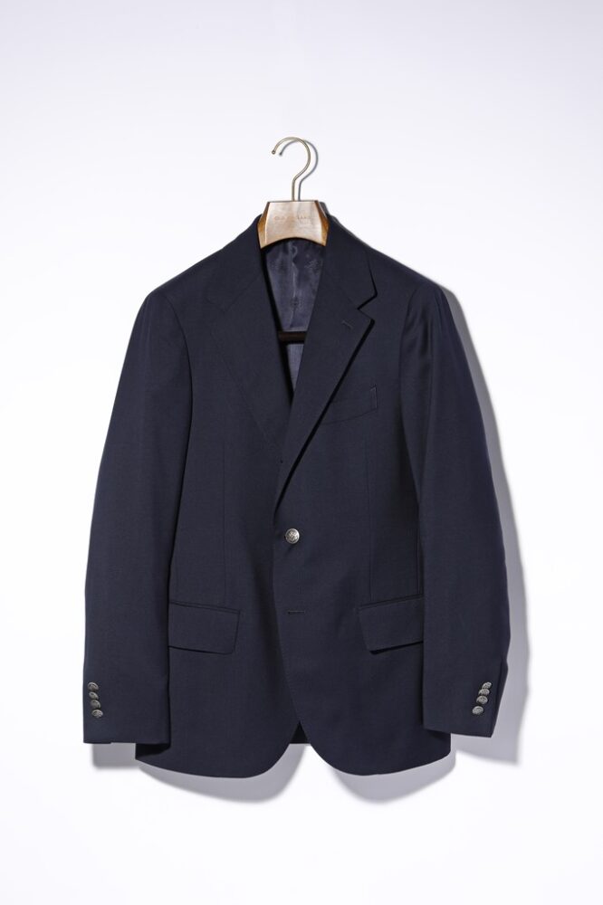 緩やかな傾斜を描くナチュラルショルダーやボックス寄りのシルエット、ゴージラインを下げ、ラペル幅を太くするなど。気取らないフレンチトラッド風味のブレザースタイルを表現。しかしながら、いせ込み量の多い袖付けや立体的パターンでストレスフリーな着心地も実現。シングル8万2500円、ダブル8万5800円