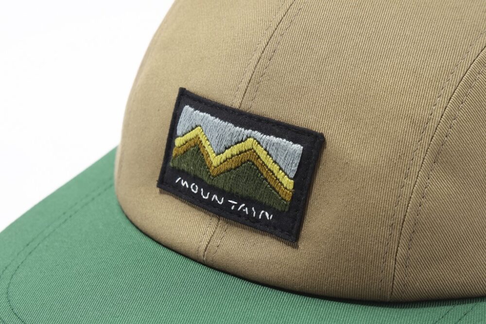 グリーン×ブラウンから着想を得て作られたハンドメイドのmountainワッペン。すべて手刺繍で仕上げているというから驚き。