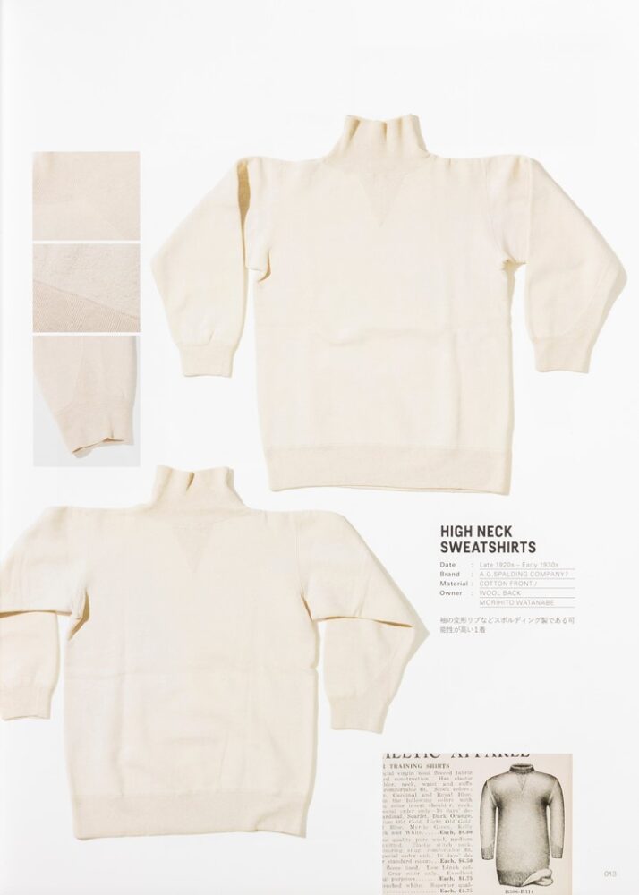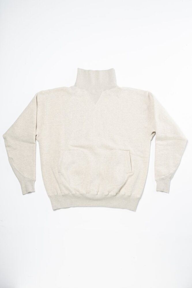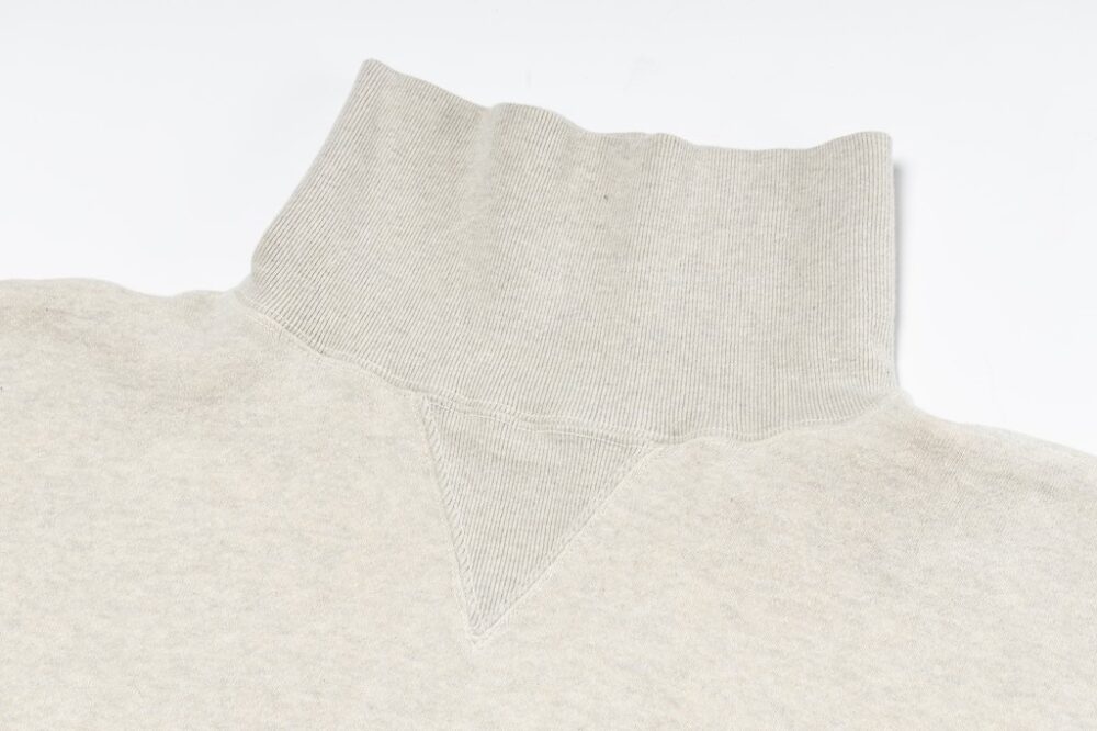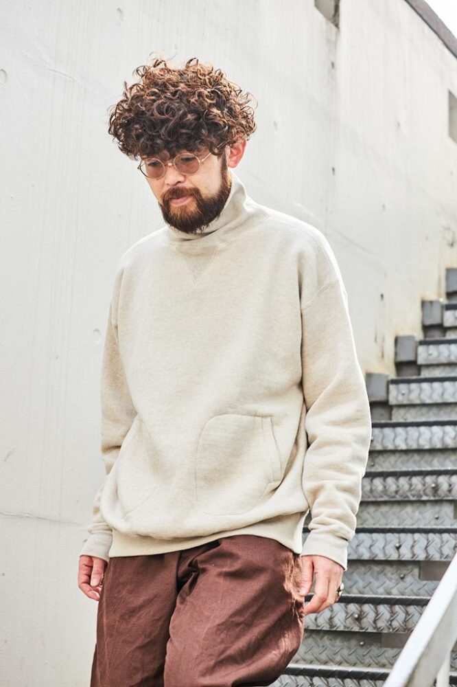 本別注のベースとなっているのは、インラインでも展開されている[タートルネックトレーニングシャツ]。デザインもカラーも、ヴィンテージをベースに製作した、これだけで十分オイシイ製品なのだが、そこにA.G.スポルディングのアイコニックなディテールである“ボクシンググローブポケット” をプラスオン。A.G.スポルディングの製品は、旧い吊り編み機でゆっくりと時間をかけて編み込まれるため、伸縮性に優れて着心地も抜群だ。