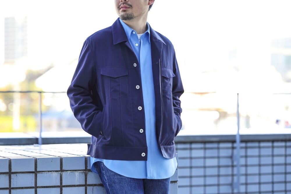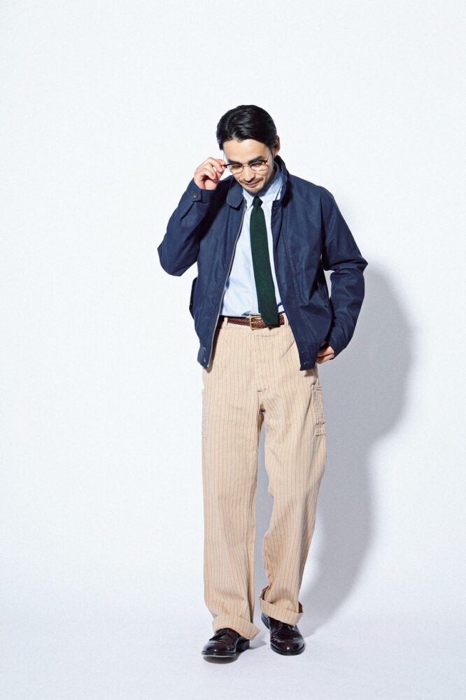 B.D.シャツを着てネクタイを締めて、革靴を履く。いつものワードローブであれば、ここでブレザーを羽織るのが定石だが、デニムジャケットやハリントンジャケットなどの定番アメカジアウターを紺ブレの代わりに羽織るだけで、一気に休日らしいカジュアルなスタイリングが完成する。