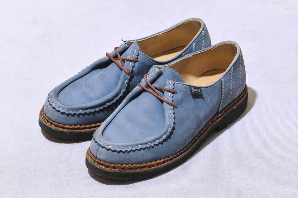 「せっかく自分で作るなら、見たことがないパラブーツにしようと思って」、ブルーのモジーンをオーダー。爽やかなヌバックで、夏場のアウトドアスタイルにも重宝。