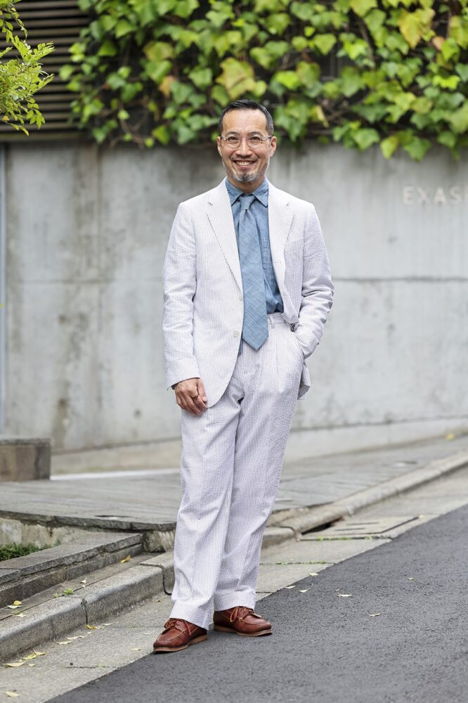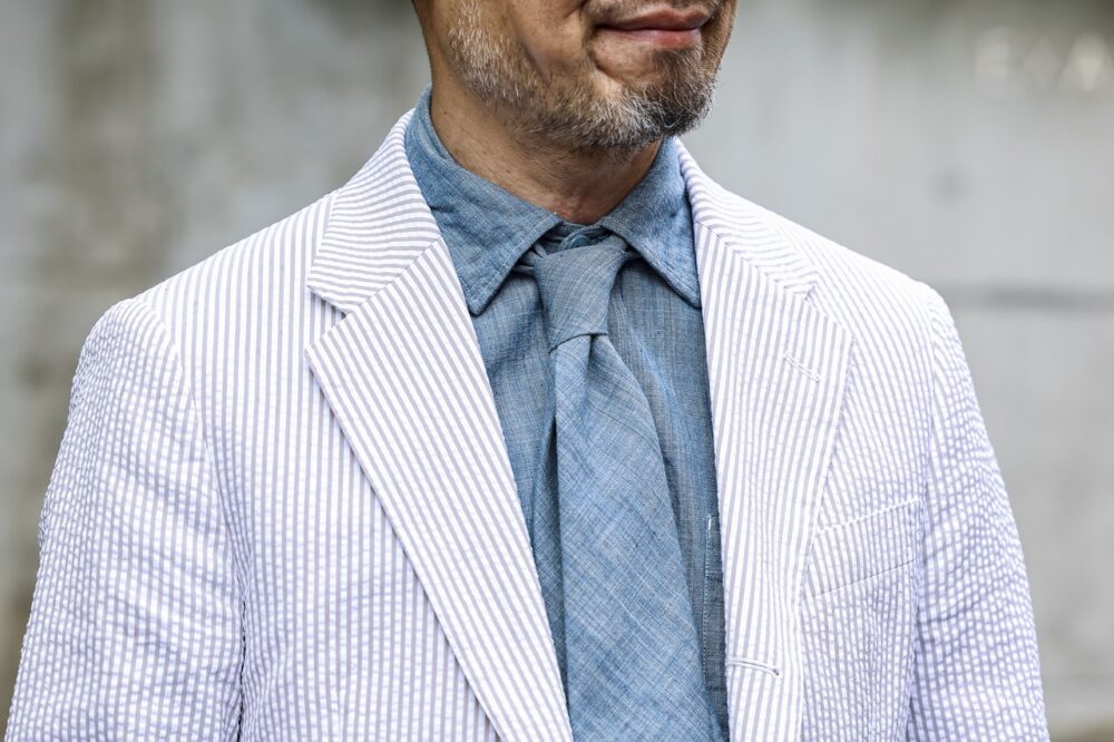 「シアサッカーの軽妙な存在感を存分に活かしながら、タイドアップで大人の余裕を。シャツとタイをシャンブレー素材で揃えることにより、適度に上品でソリッドでミニマルな見え方にしています。シアサッカーのセットアップがパジャマっぽく見えてしまわないようにね(笑)」