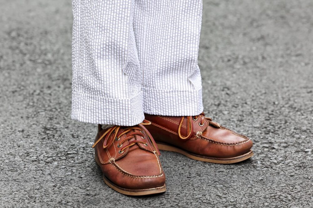 - シアサッカージャケット5 万2800 円、トラウザー2 万6400 円、シャンブレーシャツ2万2000 円/ディストリクト ユナイテッドアローズ(ディストリクト ユナイテッドアローズ☎03-5464-2715)、シャンブレータイ/ディストリクト ユナイテッドアローズ、モカシン/エル・エル・ビーン(本人私物)