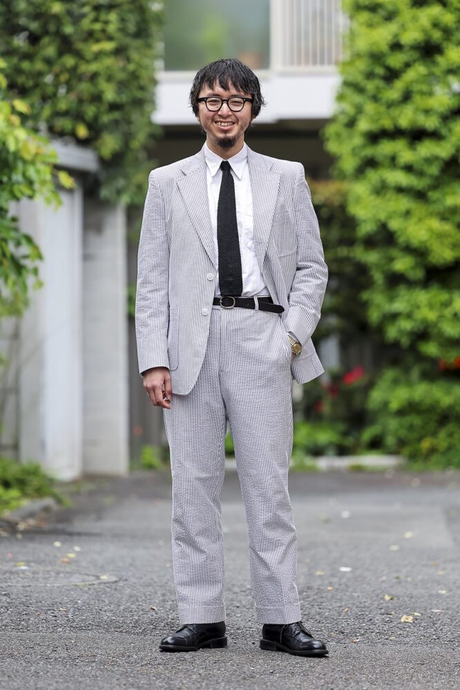 シアサッカーという王道を小襟のシャツでモダンに味付け。