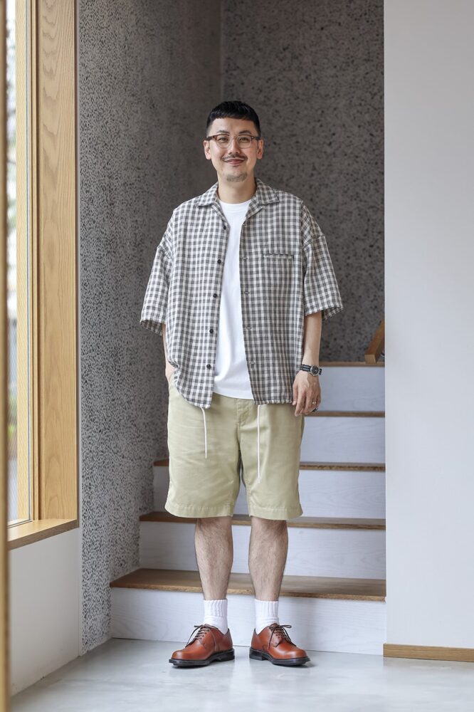 - オープンカラーシャツ2 万9700 円、カバーリングコアヤーンポケットT シャツ1 万780円、カバーリングコアヤーンチノショーツ2 万900 円/ナナミカ、ゴアテックス プレーントゥ シューズ5 万3900 円/ナナミカ×リーガル(ナナミカ 代官山☎03-5728-6550)
