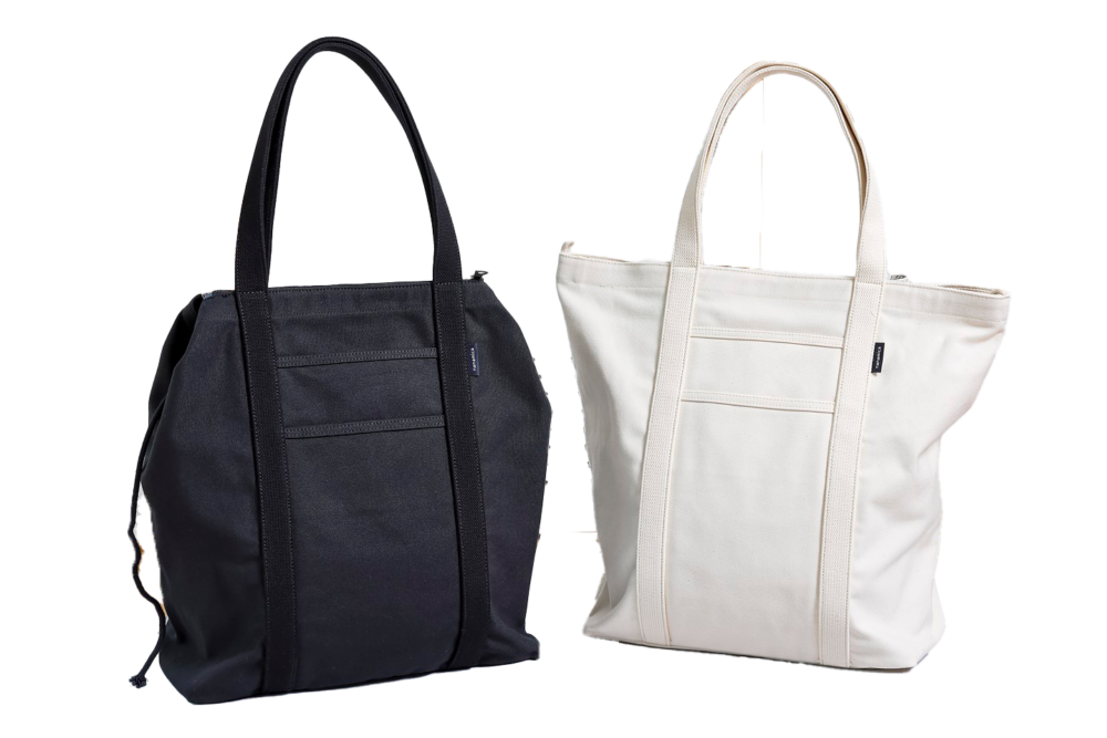 コットンとコーデュラナイロンで頑強な高密度キャンバスにして大ぶりなトートに。開口部にジップが付き、上部を紐で絞ると形が変えられる。各2万9700円(ナナミカ 代官山☎03-5728-6550)