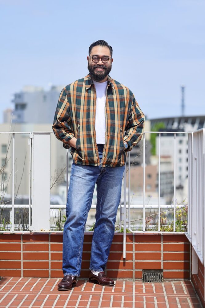 「白Tにリーバイス501を合わせた白洲次郎が自分にとってのザ・サマートラッド。その上に大柄のマドラスを羽織りました。でも、パンツは501でなく505で、この東海岸寄りにモディファイしたテーパード具合が土臭さから脱却させてくれます。白Tもサイズ感がモダンなレショップのオリジナル。原則そのまんまでなく、ひと捻り利かせたくなるんです」