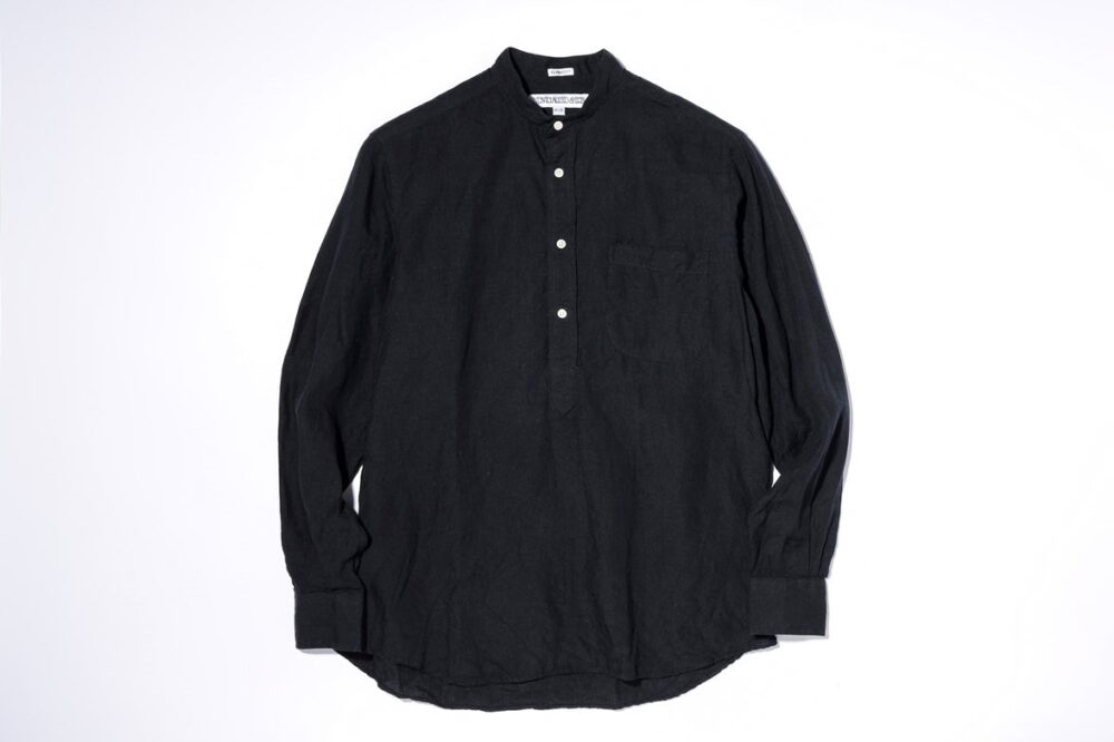 バンドカラーのプルオーバーシャツはエクスプローラーの別注。「夏でも半袖を着ない主義なので、清涼感のあるリネン素材で黒をオーダー。ゆったりとしたクラシックフィットを選びました」