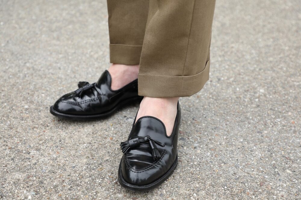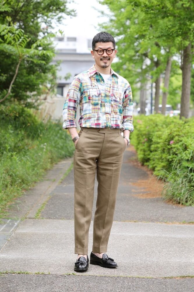 3 〜4 年前に購入したセレクトショップ別注モデル。パッチワークのマドラスチェックでインパクト大。「細すぎず、太すぎず絶妙なシルエットで、短めの丈が◎。ここ数年の自身の定番です」