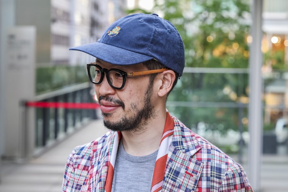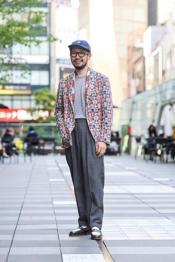 「イギリスものをベースにしながらも、エメレオンドレなどの東海岸ブランドをうまくミックスさせてみました。パッチワークジャケットが派手なので、他のアイテムを落ち着いた色味にし、足元は遊びとリラックス感あるローファーに。アメトラと英国ものは親和性があるので、国に縛られず、うまくミックスするのが自分の定番なんです」