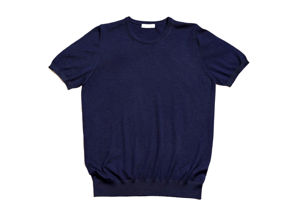 なめらかなメリノウールを使った半袖ニットは、英国の名門の自信作。「1枚でもインナーでも着られるため、シーズン問わず使える逸品。シームレスなので、ストレスフリーな着心地ですね」