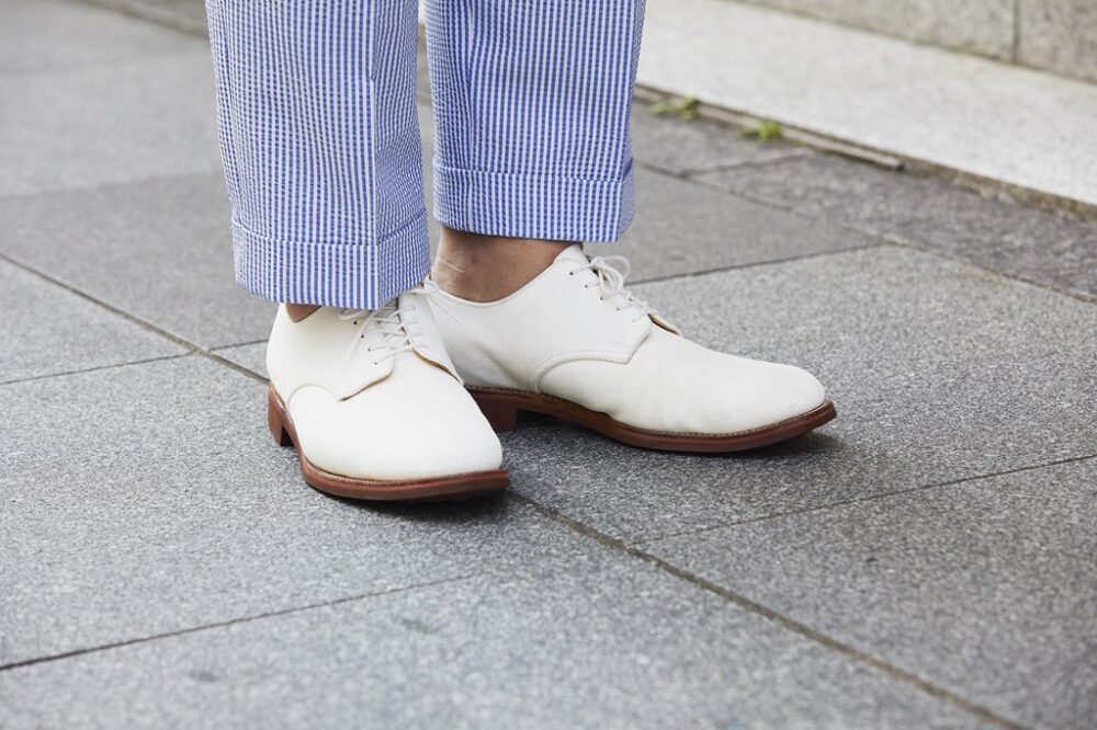 ウール、リネン、シルクを混紡したダブルブレストのサマージャケットは、ニューポートタイプのアメトラ仕様。カジュアルな素材感に対する細いピークドラペルがドレッシーさを引き立てます。さらにシアサッカー×ホワイトバックスという王道コンビに、サマーニットで色を差し、古き良きアイビースタイルに。
