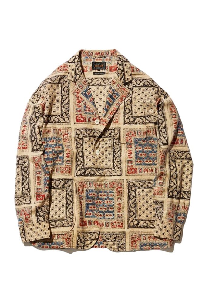 職人がシルクスクリーンした風合い豊かなブロックプリントのジャケットは夏の定番アイテム。「一枚仕立てのシャツカフなので、夏場でもサラッと羽織れます」2万6400円(ビームス プラス 有楽町)