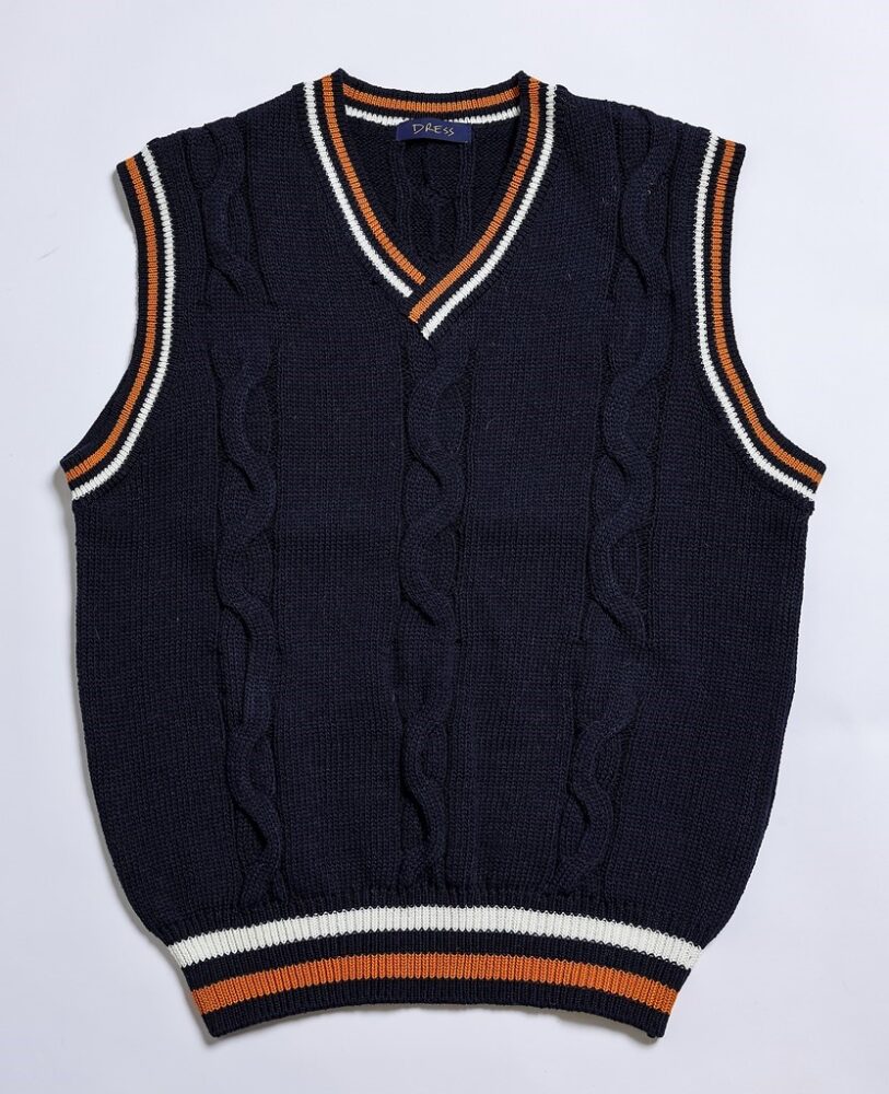 ジャーナルスタンダードの別注で作ったチルデンセーターのベスト。「コットンアクリルなので季節を問わず使えます。シンプルになりがちな夏にも重宝できるんです」1万8700 円(にしのや)