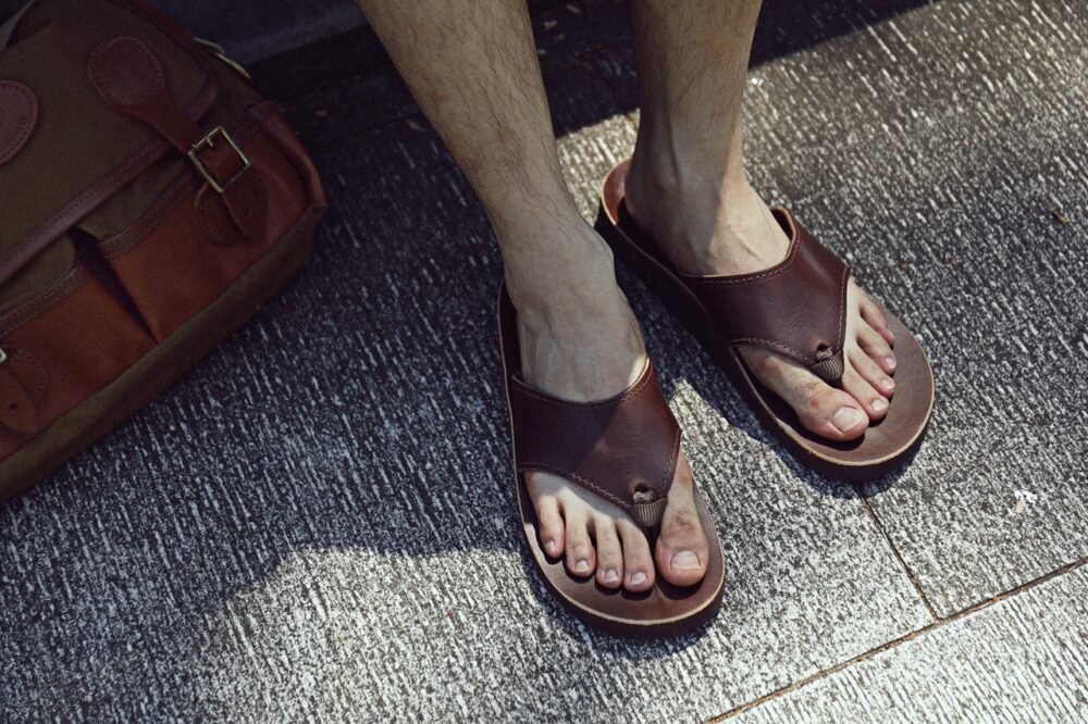 草履やビーサンといったオーセンティックな履きものに使われてきた機構がトングだ。焼肉店やパン店で使うトングのように、甲部分のパーツが二股状になっているのが特徴。肌の露出が多いため、リラクシングムードの発散力は最強。