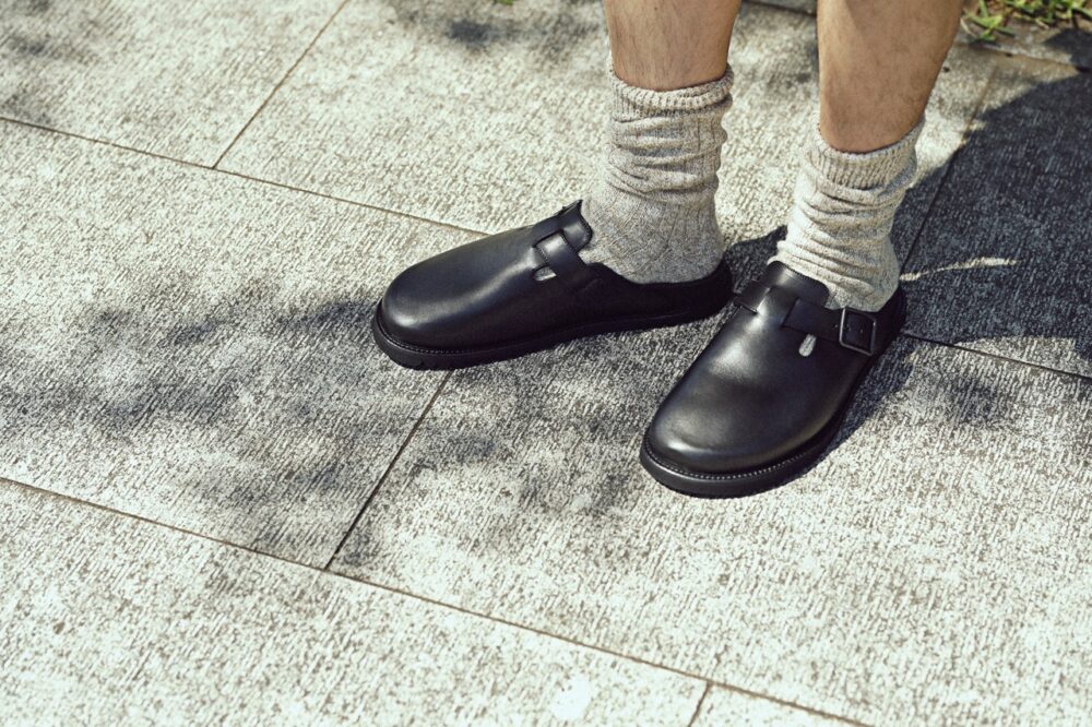 つま先から甲までを大きくカバーして、踵を露出させたデザイン。ヨーロッパの農民が履いていた靴で、北欧のスウェーデンが発祥地とされるサボは、元来は木材をくり抜いてつくった木靴のこと。ソックスと合わせて履くと、ほんのりと柔和な印象が醸し出される。