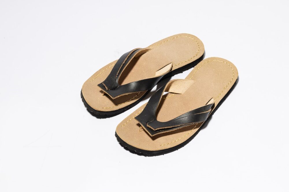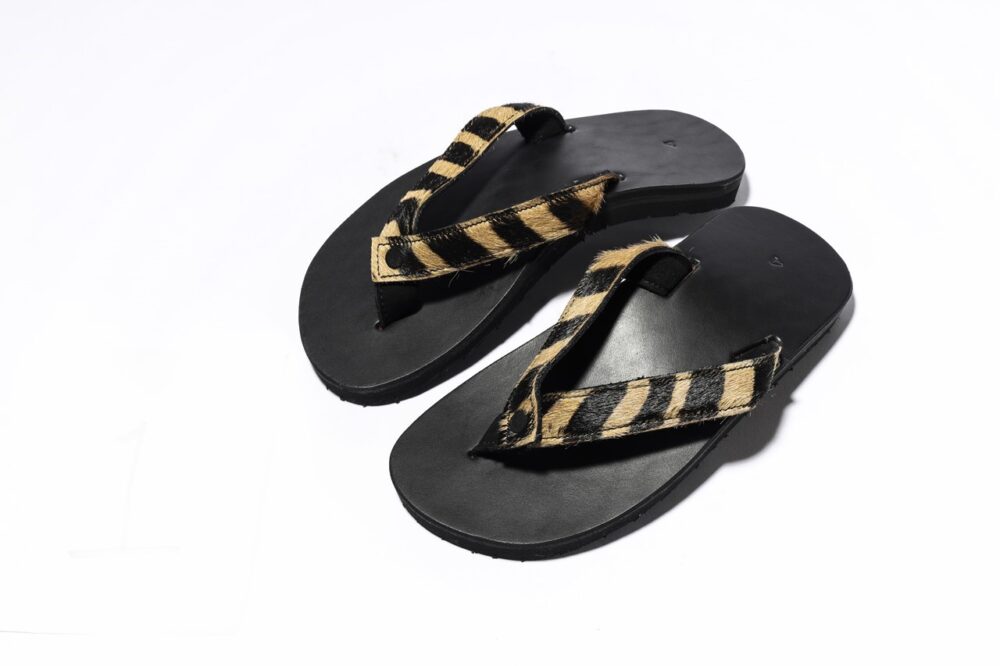 足立区のオーダー靴店、ナカムラのサンダルは土踏まずを押し上げるような形状に曲がったソールが特長。この定番品にコロナがブラックのヌメ革とハラコの鼻緒で別注。ソールはビブラム製だ。2万2000円( バク 03-6300-5043)