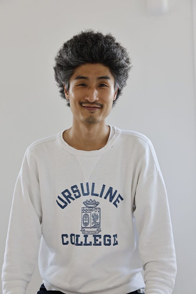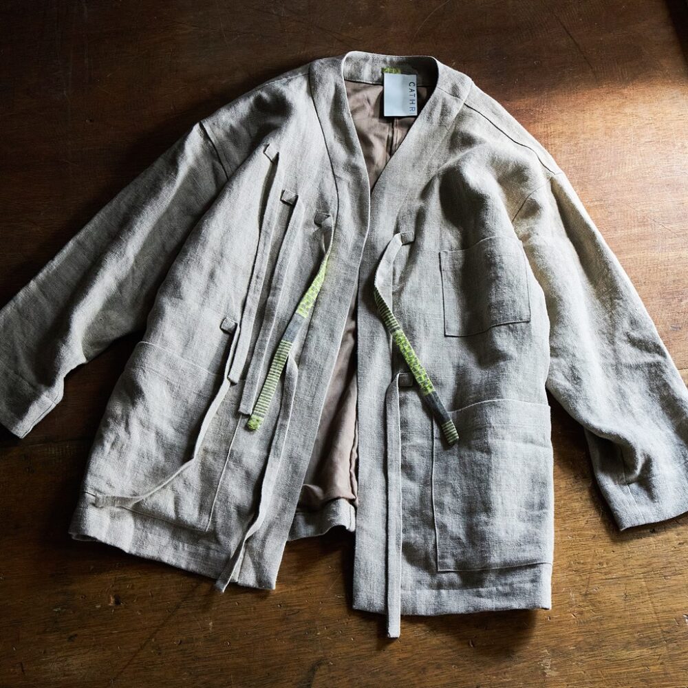 「[ハオリ]というこのジ ャケットは、リラックス感がありながら通常よりも厚みのある国産リネンのガシッとした手触りが特徴です。なにより伝統技法である「久留米絣」の取り入れ方が秀逸。フロントの紐ふたつ、両脇のポケットのジップ部分など、あえて見えづらい部分にしか入っていない。色もベージュのボディに、同系色であるイエローの絣。言われなきゃ分からないこのさりげなさが、ファッション的かつ日本的で好きなんです」