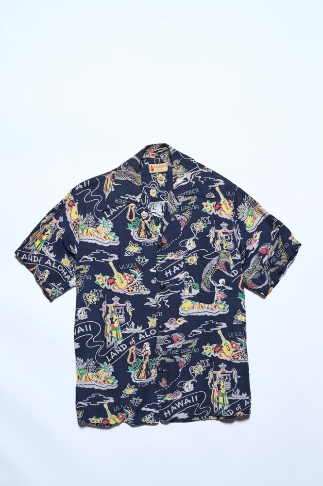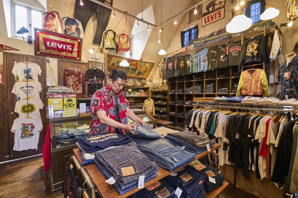 デニムはもちろん、モーターサイクル系、ハワイアンシャツも多くセレクトされている。また高い天井が特徴的な店内には、至る所に当時、販売促進用に作られたバナーやサインボードが飾られ、賑やかな印象。