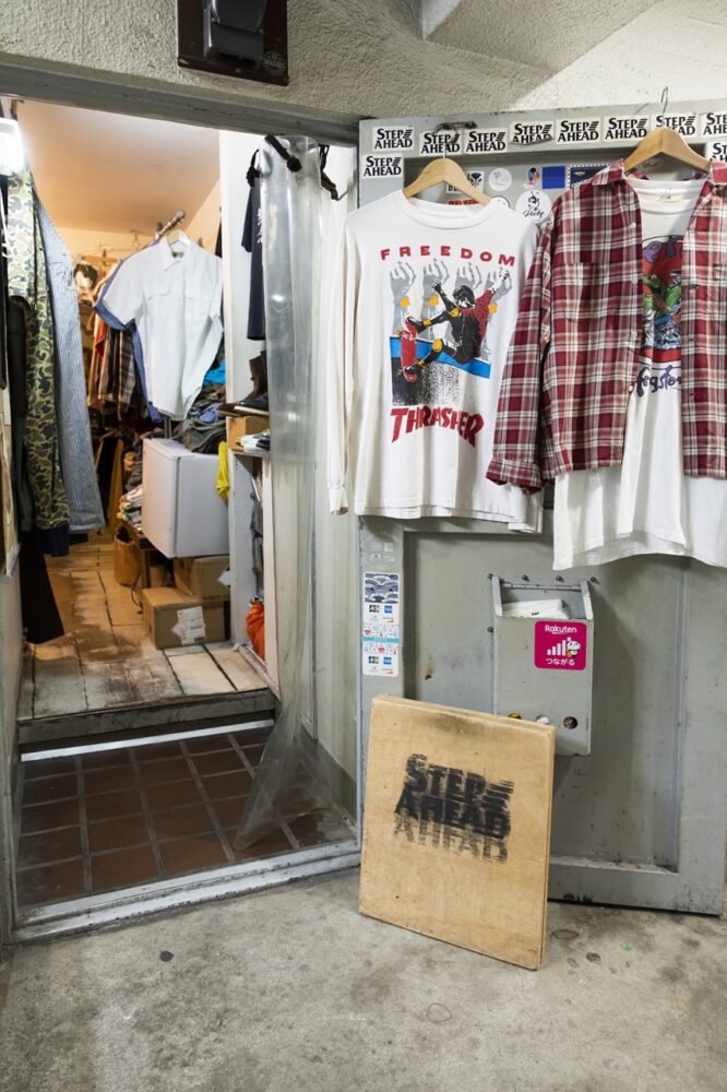 原宿キャットストリートから1本、小さな 裏通りに入り、趣のある旧いマンションの2 Fの1室にあるステップアヘッド。店内は、往年のオールドスクールな古着がぎっしりと詰まったような印象で、入口から奥に入るほど、ヴィンテージ色が強くなる。