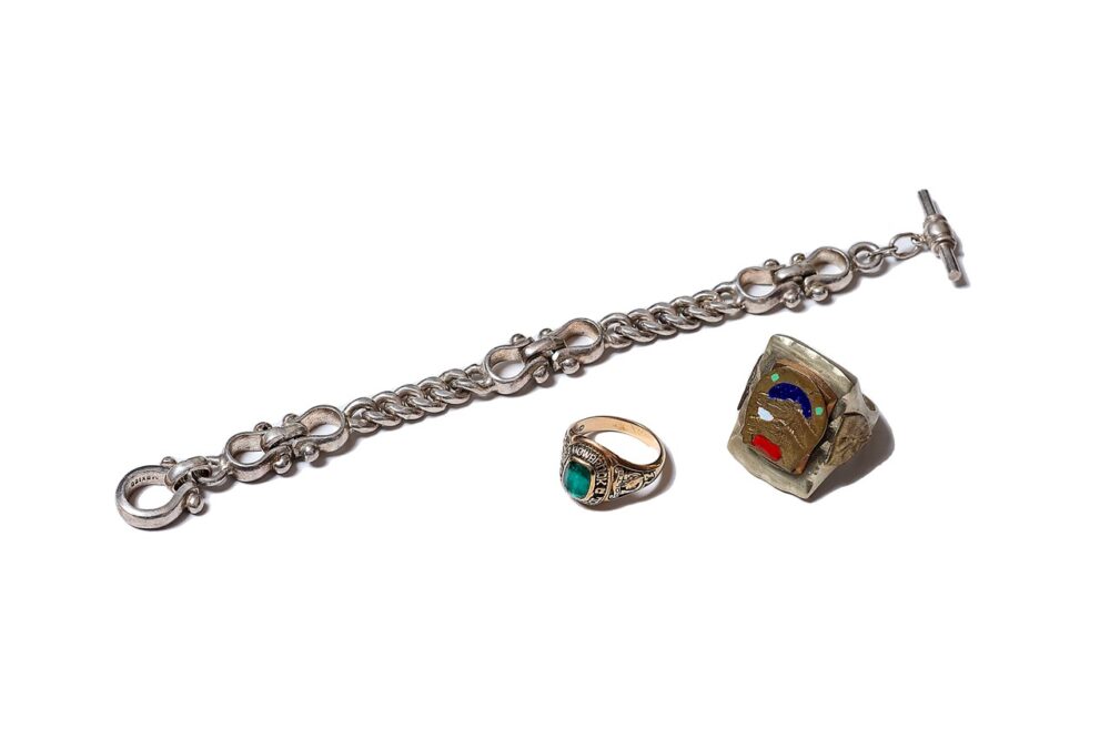 相場より少し安い価格設定も人気の秘訣だというアクセサリー類。メキシカンシルバーのブレスレット2万1780円、10Kカレッジリング3万9380円、メキシカンリング3万8500円