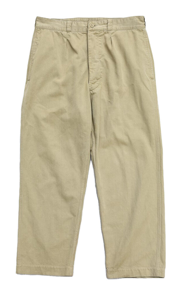 仏軍の定番チノパン。50〜60年代にかけて生産されたアイテムとなり、いまの時勢にあった大きめのモデルは年々希少になっている。2万2000円