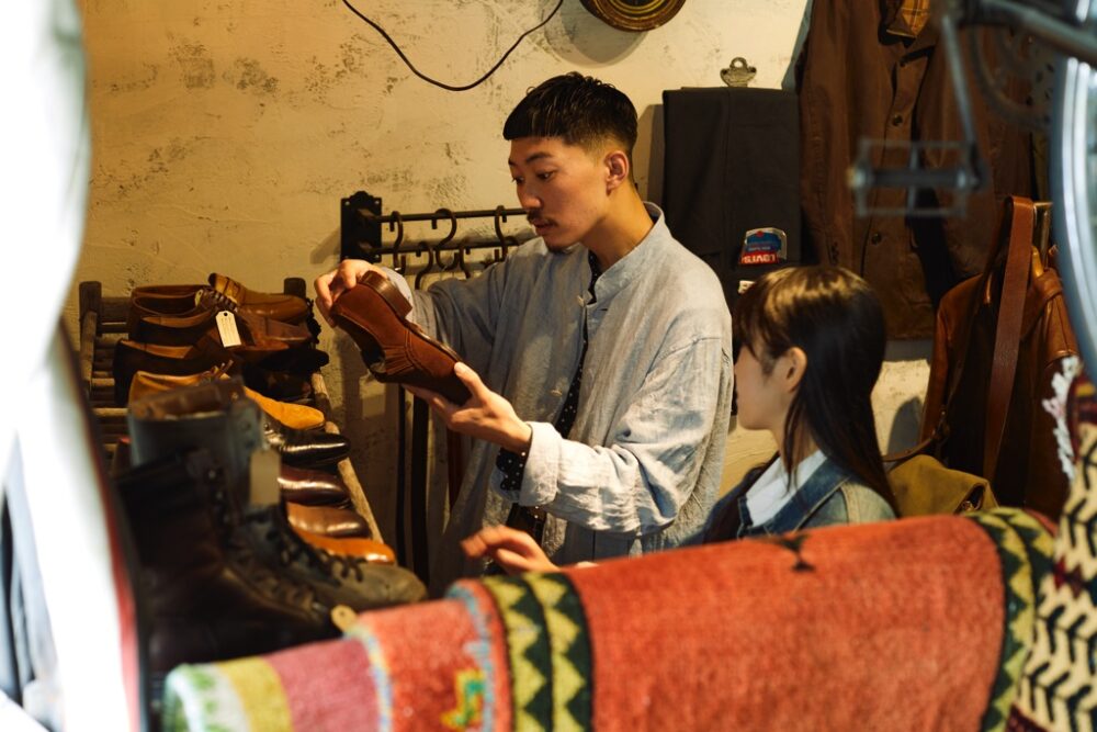 インダストリアルな雰囲気に包まれた店内に、ヨーロッパとアメリカそれぞれで買い付けられてきたアイテムが所狭しと並ぶトランク。こちらの1号店はメンズのみで構成され、近隣にある2号店にはレディスも展開されている。そんな異国情緒溢れるお店に対し、勝河さんは明確な目的を持つ。