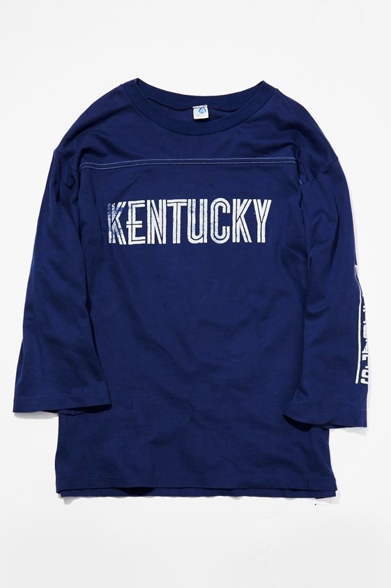 フットボールTシャツ特有の縦長のシルエットに浮かぶ、白のクラッキングプリントとステッチがなんともアメカジらしい雰囲気のいい一着。8580円