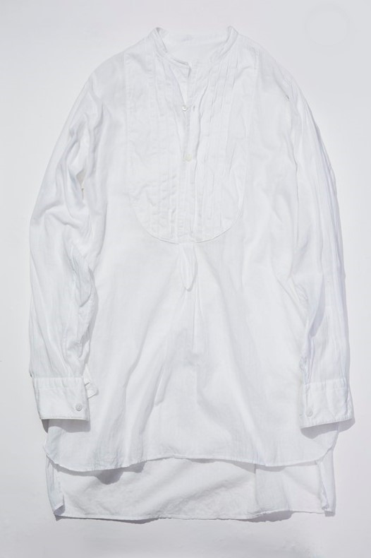 40 ~ 50年代頃のドレスシャツ。特有の長細シルエットに、セパレイトタイプとなるカラーレスやフロントのエプロンプリーツが存在感を放つ。1万780円