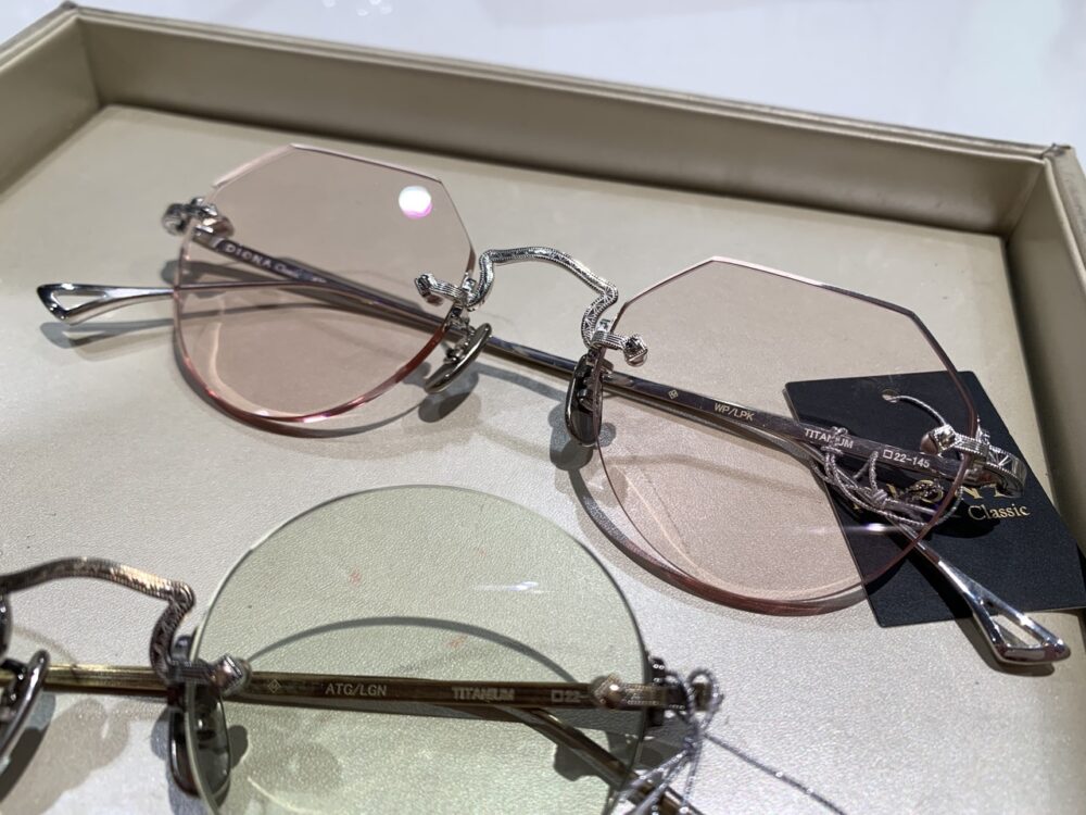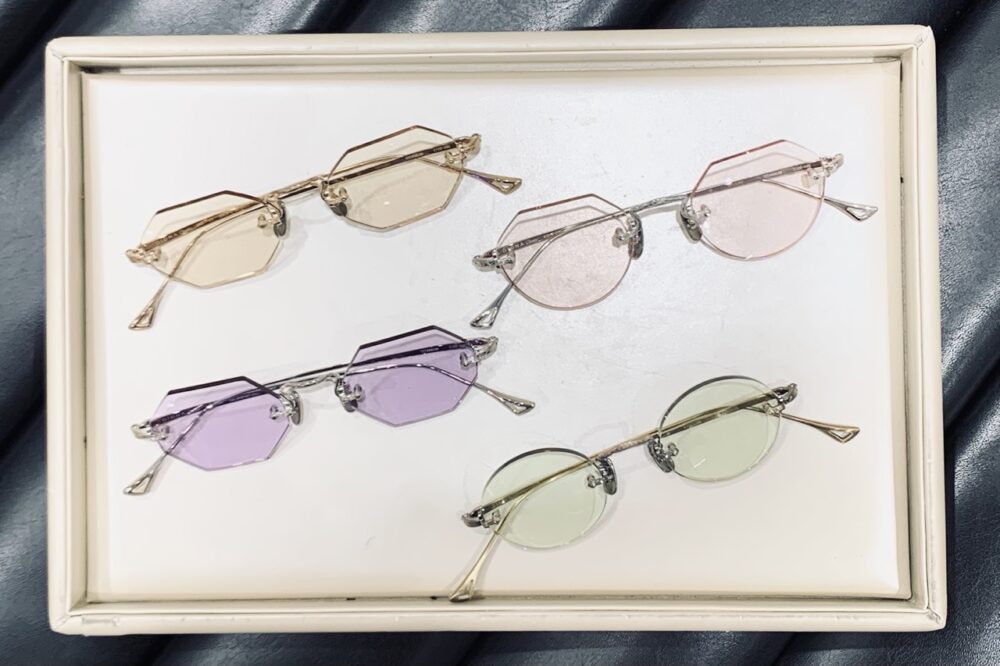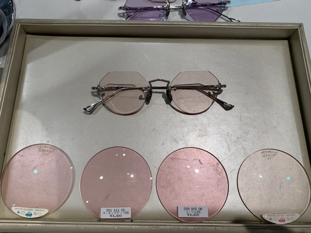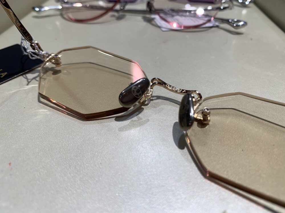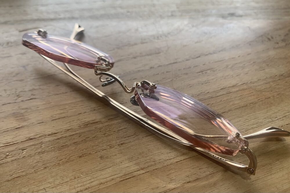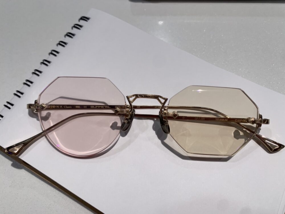 その他のフレームもレンズの色変えなどオーダーし、待つこと数週間。待望の【ツーポイントのリムレス】【ゴールドフレーム】【オクタゴンレンズ】【ピンクのカラーレンズ】というオーダー通りのメガネが完成。レンズ断面からチラリと覗くピンクがなんとも色っぽいではありませんか!