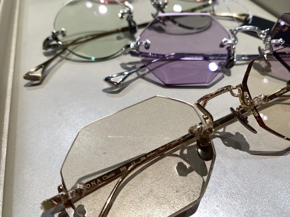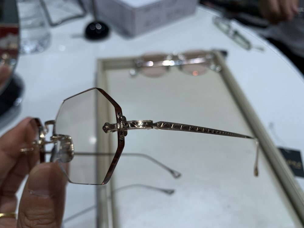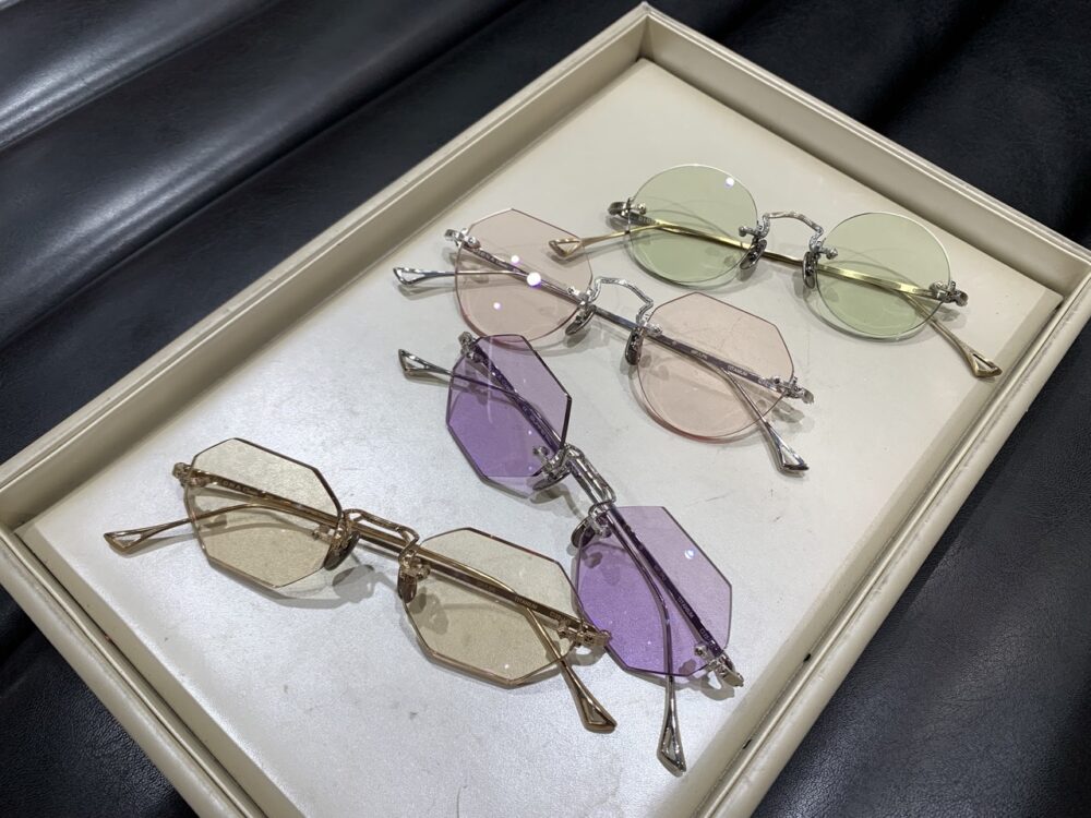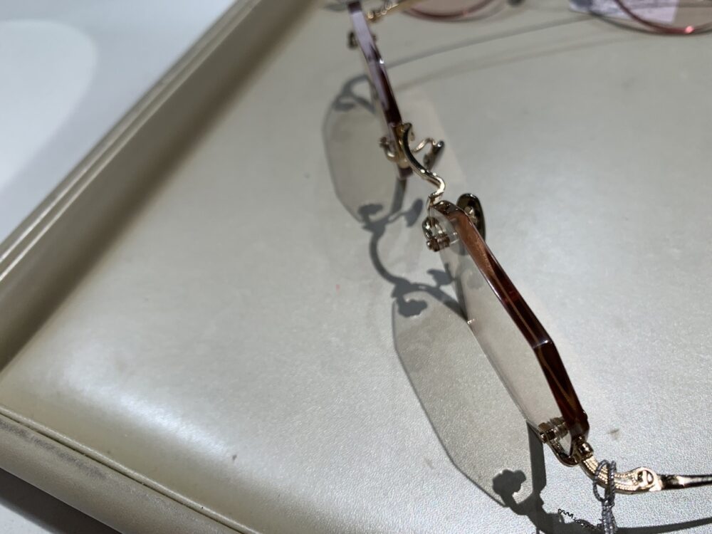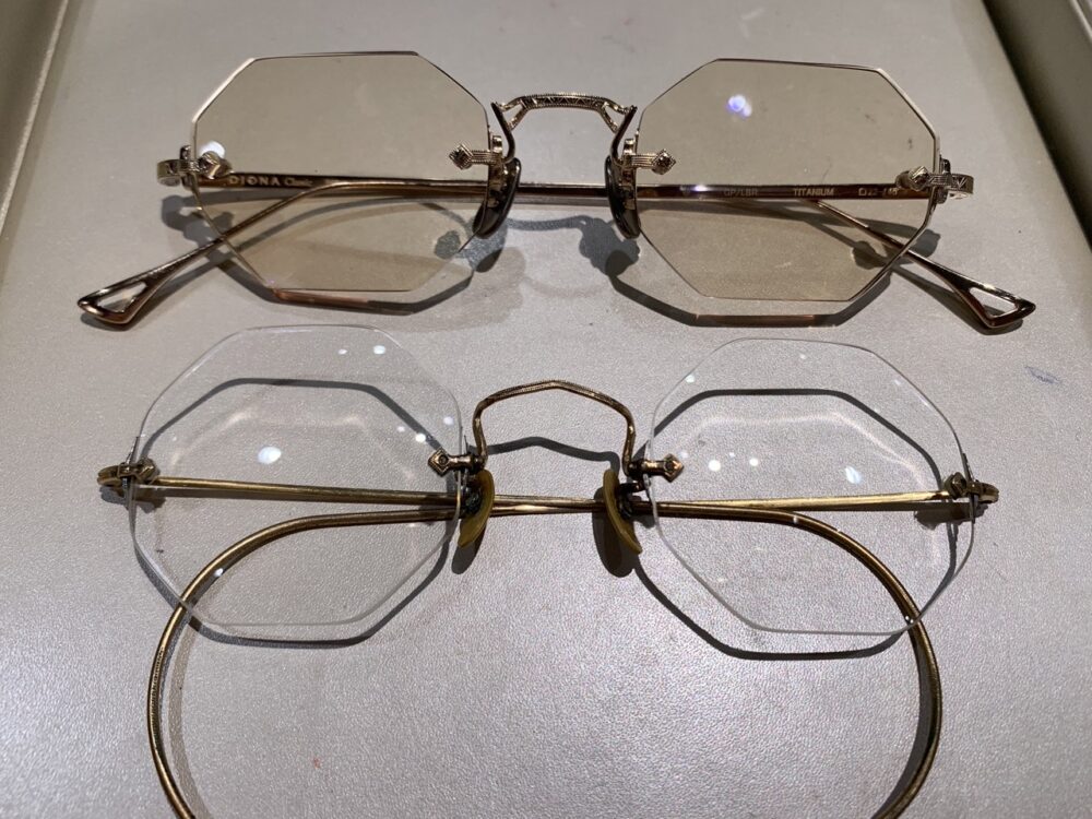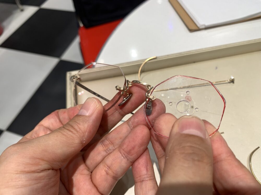 その他のフレームもレンズの色変えなどオーダーし、待つこと数週間。待望の【ツーポイントのリムレス】【ゴールドフレーム】【オクタゴンレンズ】【ピンクのカラーレンズ】というオーダー通りのメガネが完成。レンズ断面からチラリと覗くピンクがなんとも色っぽいではありませんか!