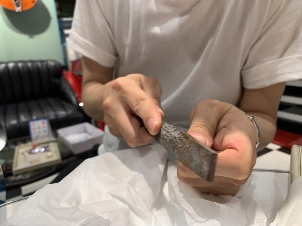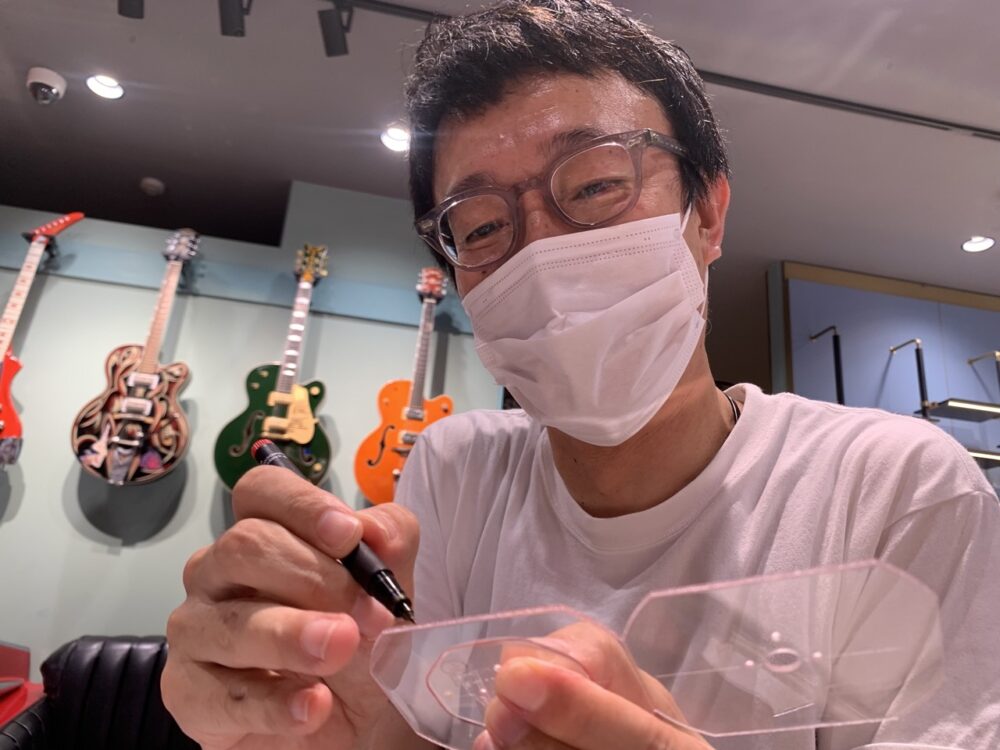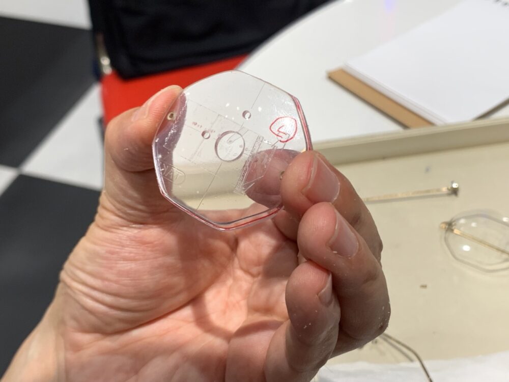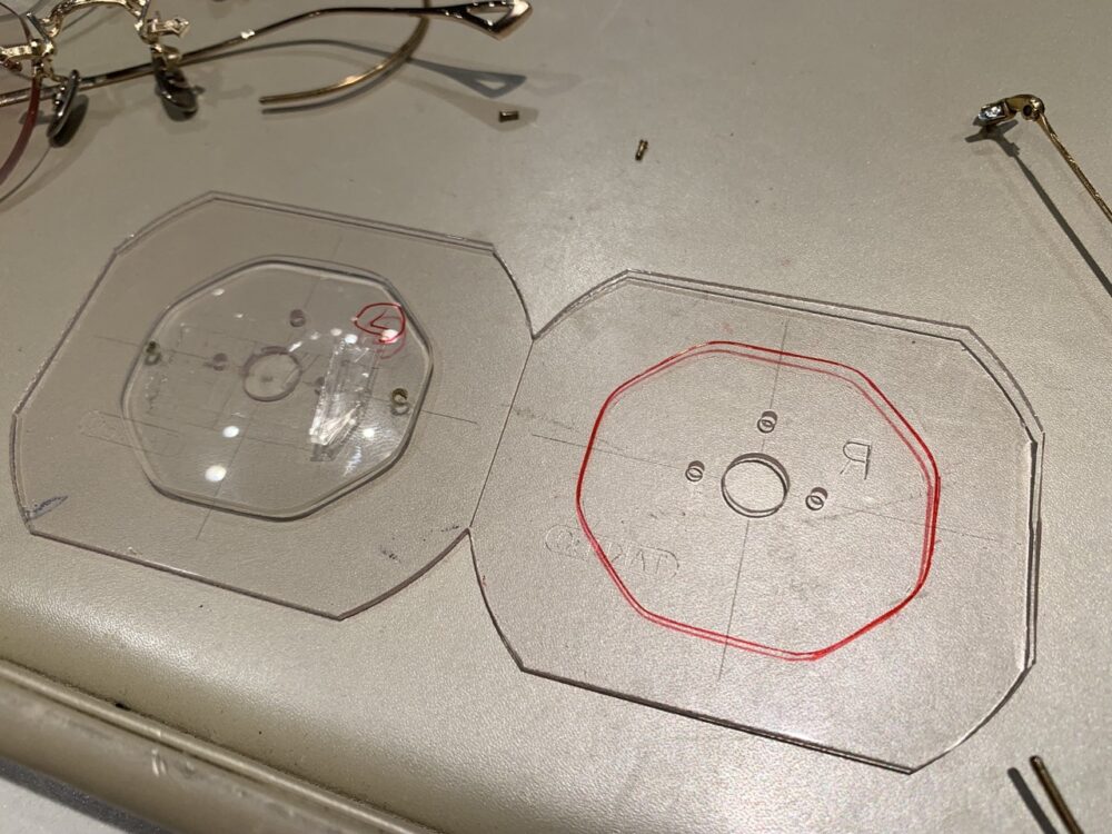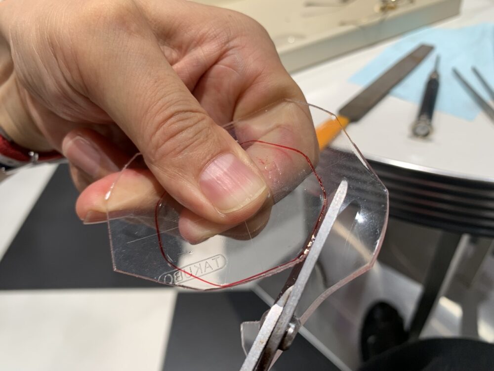 どんな風に加工するかというと……いたってアナログ。ビンテージのレンズを外し、ペンでプラスチック板にトレースしたのちに、ハサミで切り出し、ヤスリで整えて、元となる形状と同じになっているかと見比べて、調整&調整&調整。「昔の眼鏡店はみんなやっていたことですけどね、今はやっていない店も多いと思います。リムレスならパリミキにお任せください。古参スタッフを中心に対応させていただきます!」。これをベースに実際のレンズをレーザーなどでカットしていくという。