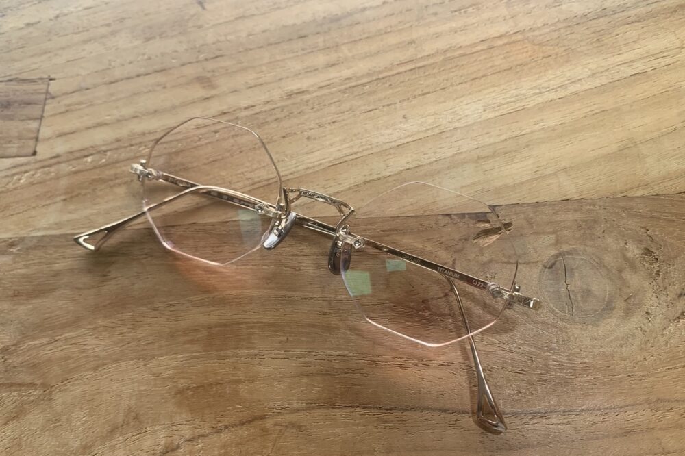 かねてよりツーポイントのリムレス、しかもレンズが丸みを帯びたオクタゴン型というビンテージメガネを所有している私。ただし、リーディンググラス用のヒンジのため、近眼用レンズを装着することは叶わないとのことで、リムレスのクラシックなフレームを探していたのだ。そんな折にDIGNA Classic新作発表! トレンドの一歩先を行くツーポイントのリムレスフレームに心が躍る。さらに見てみてびっくりの精巧な作り。所有するビンテージ以上にテンプルやブリッジの彫りが緻密。
