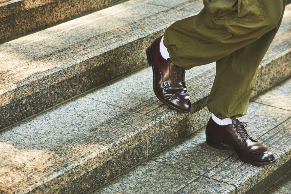 オールデンにおいて、足の治療や運動機能の補助を目的としたオーソぺディック・シューズの製造が本格的に始動したのは5 0年代。モディファイドラストは、1963年に誕生している。同年にこのラストを使用して生み出されたのがアルガンコンオックスフォード、通称Vチップだ。コードバンの色気がたまらない。