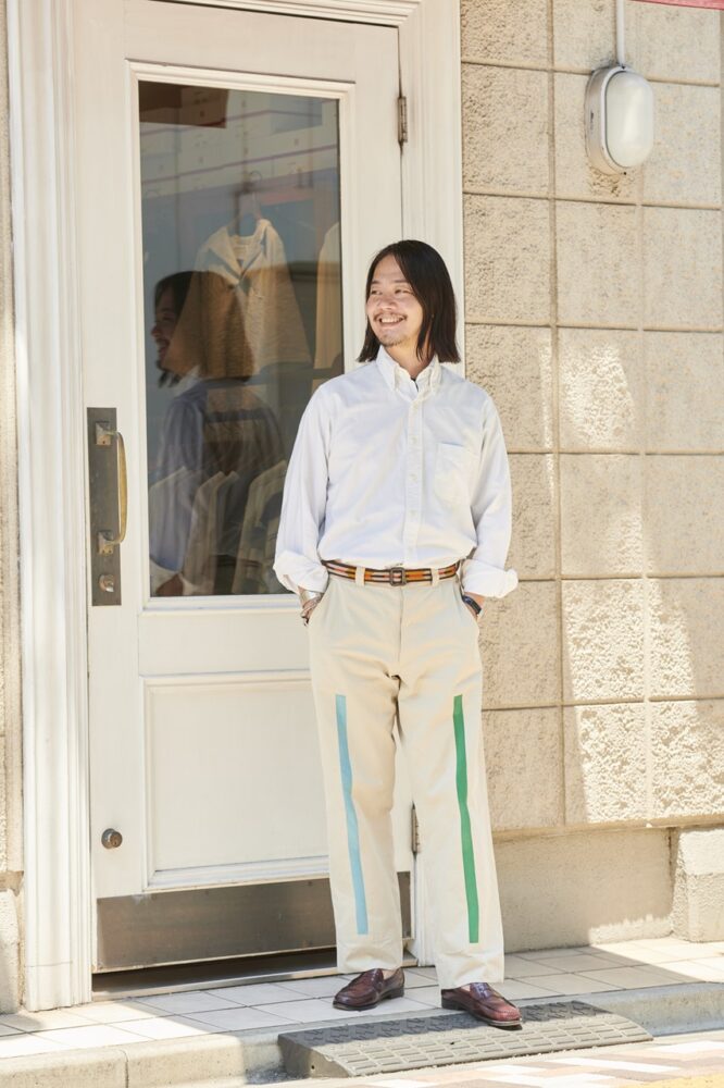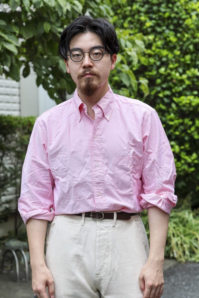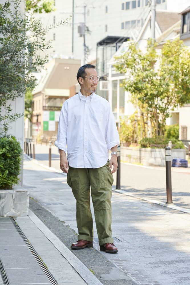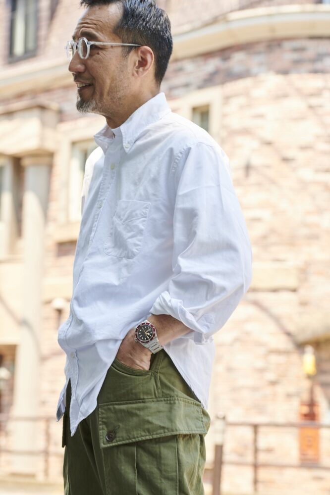 「ブルックスブラザーズのポロカラーシャツは、マディソンフィットという昔ながらの大きめのシルエットのものを好んで着ています。もちろんメイドインUSAで、これが廃盤になるという噂を聞きつけ、急いで複数買いしたのはいい思い出です (笑)。このゆったりとしたシルエットを活かしたいので、全体のバランスも考慮していますね」