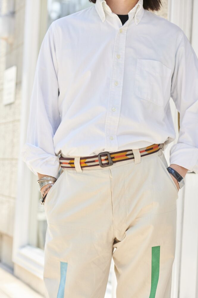 ただ普通にコーディネートするとシンプルになりすぎるので、タックインして正統派な着こなしをしながらも、カジュアルなベルトだったり、遊びのあるパンツでバランスを取りました。足元はアメトラ定番のペニーローファーで締めました」
