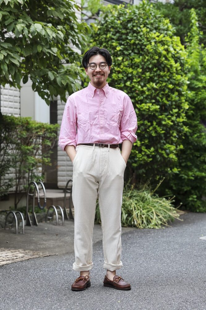 中でもピンクがお気に入りカラーとのことで、コットンリネンのチノを合わせ、色味を引き立てるコーディネートを披露。足元にキャンプモックを合わせアメリカらしさを演出している。