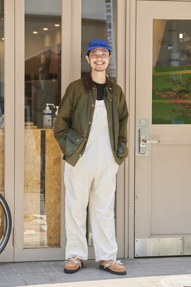 「ビデイルは、ショート丈でバブアーの中では合わせやすいモデルではありますが、これでBDシャツなどではあまりにもひねりがありません。ただトラディショナルな雰囲気を壊したくもないので、ヴィンテージのオーバーオールをセレクト。ここでデニムだと浮 いてしまうので、爽やかさもあるホワイトのツイルに。足元はモカシンでアメトラのテイストもプラス」