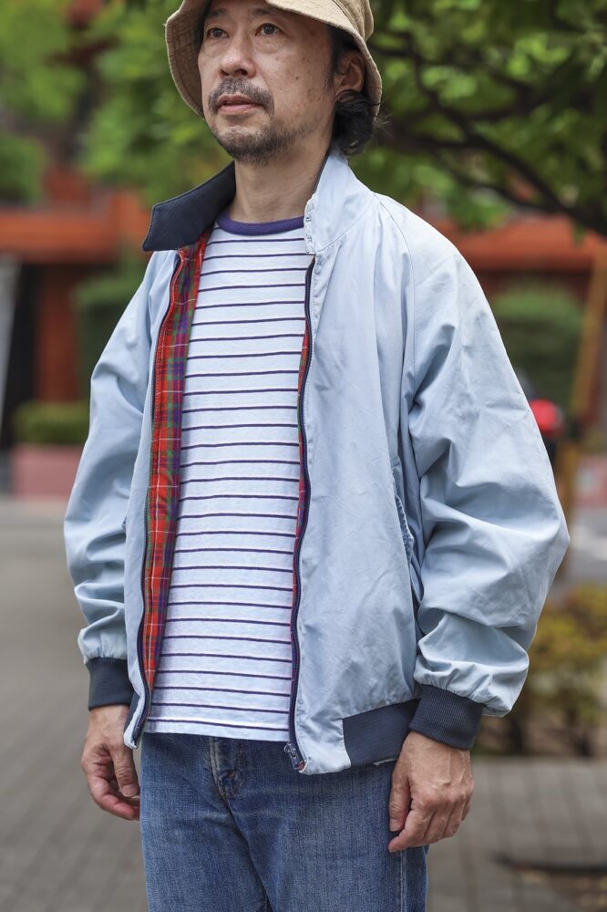 「80~90年代にかけて販売されていたG9の中で、ボディとリブの色が異なる2トーンのものは、このライトブルーだけでした。僕自身も当時はその魅力に気がつかず王道のナチュラルカラーを購入。しかし買っとけばよかったという思いが拭いきれず、10年ほど前に古着で入手。同じ配色のTシャツ、リブに近い色のデニムを合わせ、英国繋がりのバケット ハットをかぶって楽しんでいます」