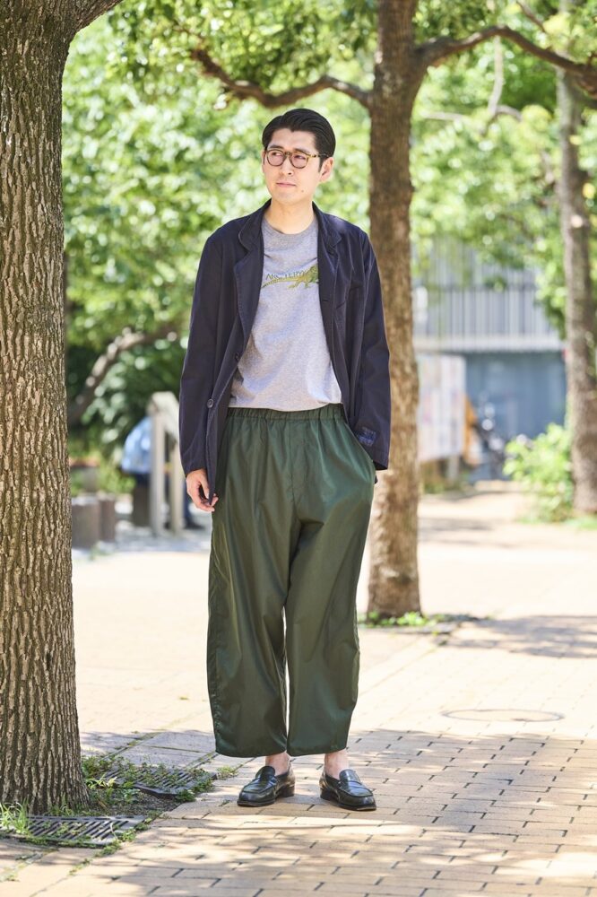 ジャケットにイージーワイドパンツというリラックスしたスタイルに、名作ローファーをプラスした瀬谷さん。インナーのアークテリクスのTシャツもいいアクセントになっている。
