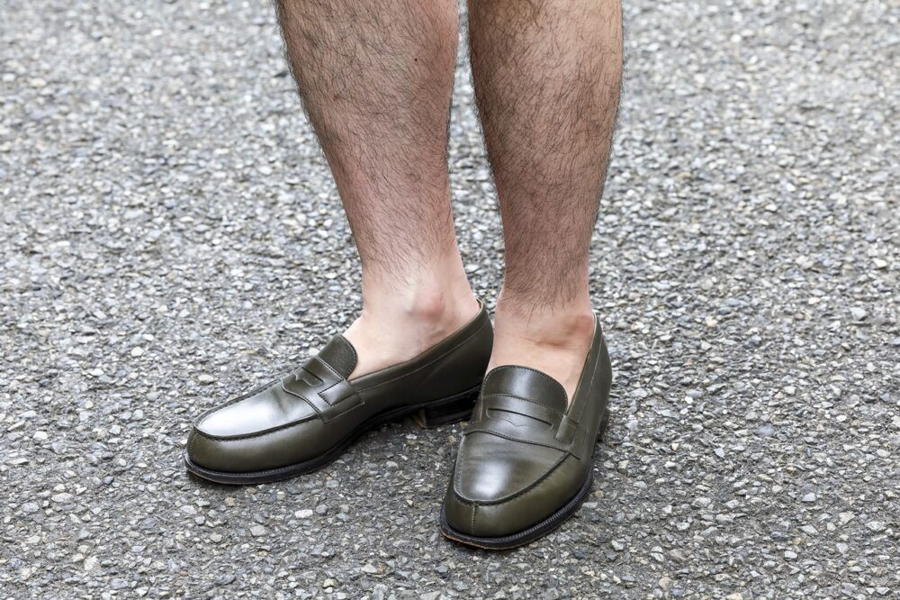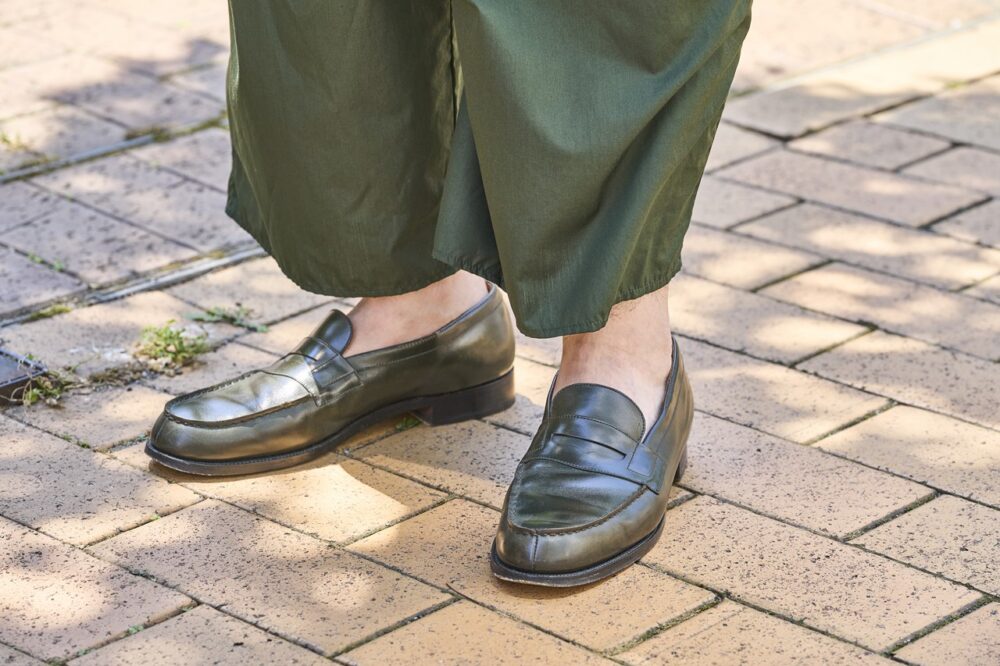 「ローファーは現在はオーダーのみ受け付けているハンターグリーン、ケーシービダランのジャケット、クリスタセヤのパンツを選びました。ブラックとブラウンを行き来できるカラーリングで、思っている以上に汎用性が高いんです。今の時期だと素足でワイドパンツに合わせるのが気分です。よりトラッドなスタイルにもマッチしてくれるので、これほど万能な靴はありませんね」