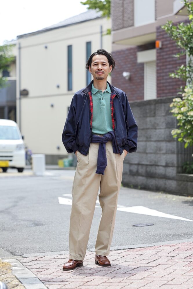 「イタリア靴ほど男前じゃなくて、アメリカ靴ほど武骨じゃない。ちょうど中間の位置づけで、つくりにはエレガンスが感じられる。それが180シグニチャーローファーの魅力だと思いますね。どんなスタイルにもハマってくれるので好きです。アウターには50年代くらいのバラクータのG9を選び、フランス製のラコステを差して、ウィリス&ガイガーのチノパンを合わせています。腰にはヴィンテージのスウェットを巻いてみました」。