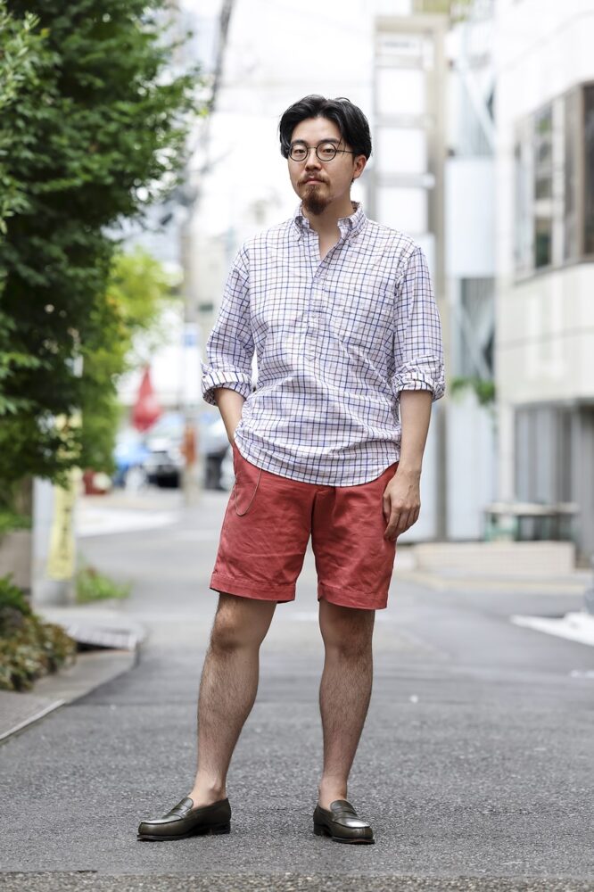 「当時 “ウェストンは細くタイトに履くもの” というストイックな思いに駆られていたので、小さめのサイズを購入。自分の足にアジャストするまでが大変でした (笑)。一度慣れてしまうと、カジュアルだけど端正で上品、唯一無二の存在です」と魅力を語る早野さんの着こなしは、シャツとショーツで足元の色味を拾うコーディネート。
