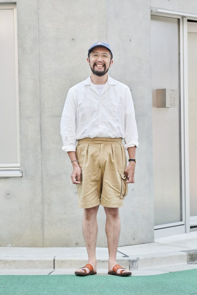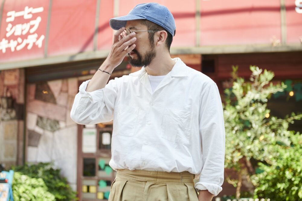 「今日着ているのは、モヒートとインディビジュアライズドシャツのコラボと なるアブサンシャツです。このシャツの他にも吊るしから、カスタムオーダーまで様々なデザインを所有しています。このシャツはもちろんのこと、インディビジュアライズドシャツのアイテムを定番だと思っています。自分の好みをオーダーするのも楽しいですし、こうやって服を深く理解したデザイナーの方々の別注を味わえるのも醍醐味。そして頑なにメイドインUSAを貫くという点を加味すると、唯一無二の存在ではないでしょうか」