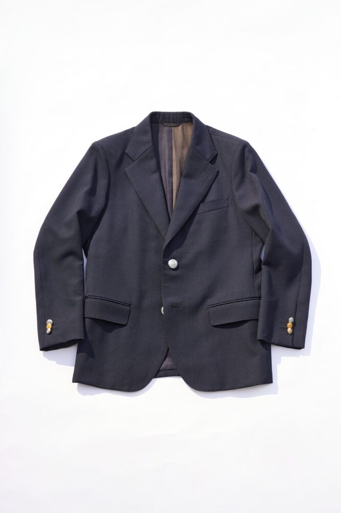 2年ほど前に企画し、完売したブレザーを、今年は再販予定。アメリカとフレンチのテイストを織り交ぜながらも、しっかりとベーシックに仕上げている。「アソートのアンティークボタンで、裏地には残反を使うなど、サスティナブルなもの作りを実践しています」5万8300円(ファーストハンド レイヤード ミヤシ タパーク 03-6805-1828)