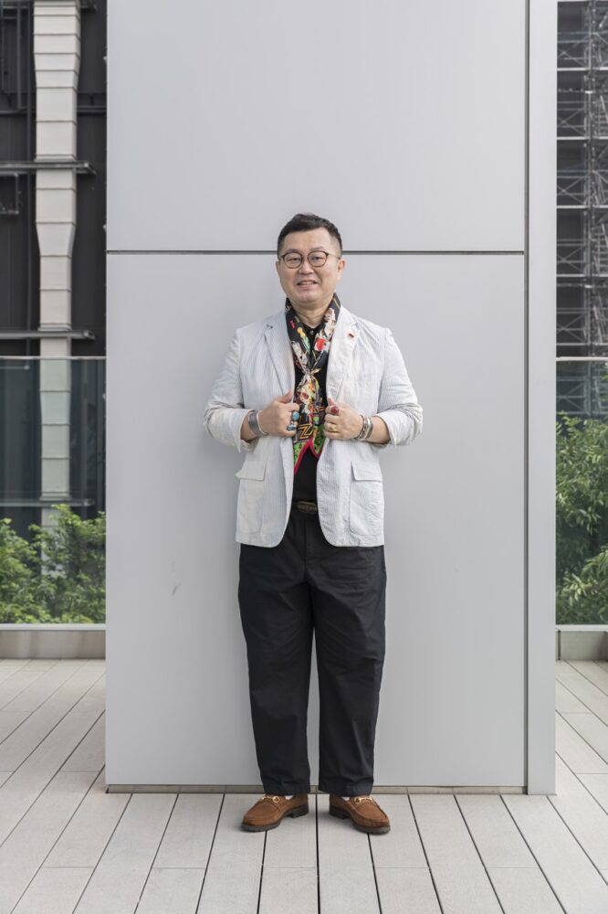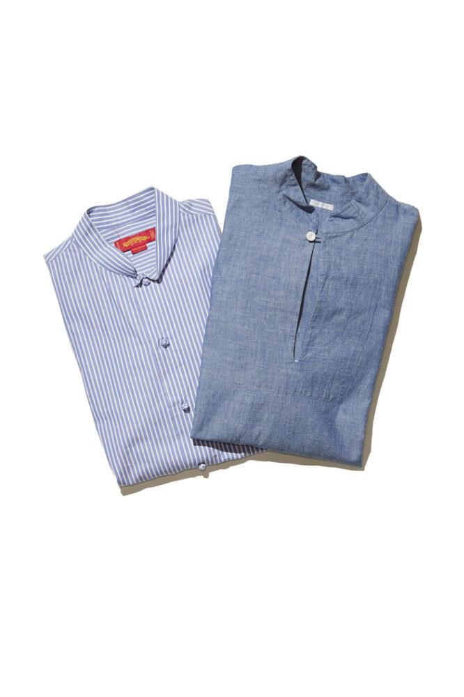 中国の正装、すなわちトラッドな襟型がマオカラーだ。「タックアウトで、たっぷりとしたサイズ感のものを洗いざらしで。どことなくオリエンタルなムードを醸すことができ、アジアの原風景的なスタイリングが完成します」。右のシャツ2万4200円/ (ソウボウ)、左のシャツ/シャンハイタン(本人私物)
