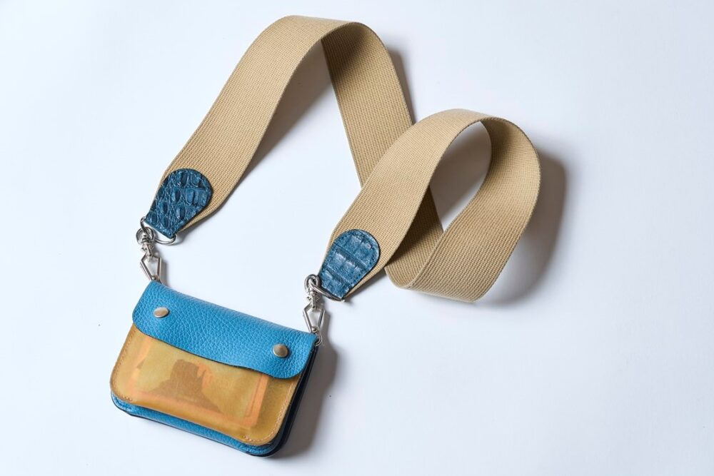 首から下げるためのストラップが付いた財布。スナップボタンでメインパーツと小銭入れ、カード入れを結合。「各パーツの色を自分で選んで、自分だけの 1点をつくることが可能です。半年に1度、メイデンズショップでポップアップを展開していて、その際に組み合わせをオーダーしていただけます」。本人私物
