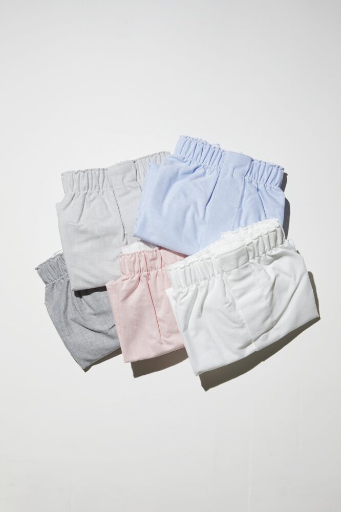シャツに使われるような粗めのオックスフォード地が特徴。ウエストにグッドデザインを取得したBBゴムと呼ばれるワッフル形状のゴムを採用。腹部への当たりが優しく、また繰り返し着用してもダルダルに伸びにくく、新定番に推したい。